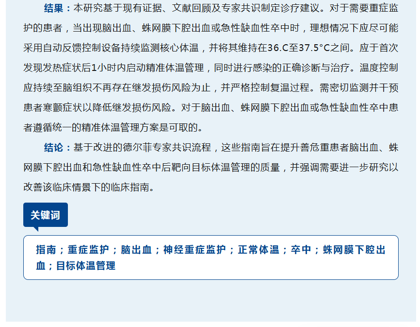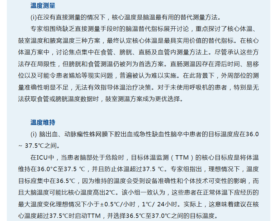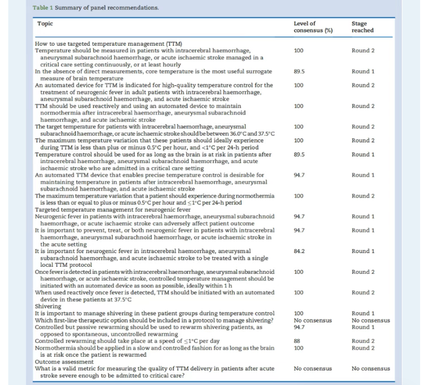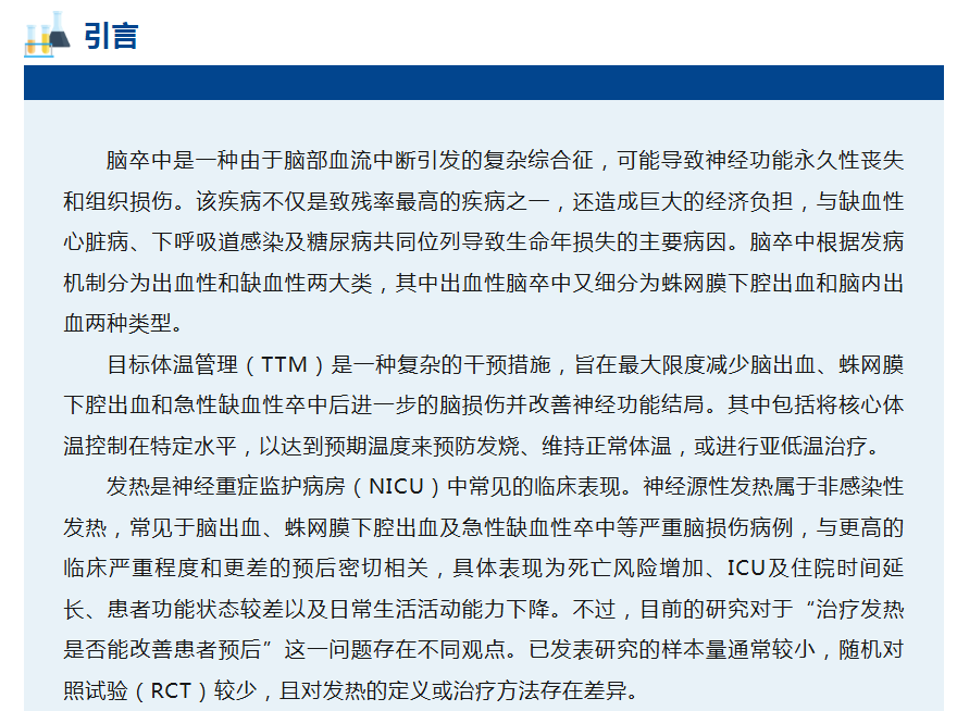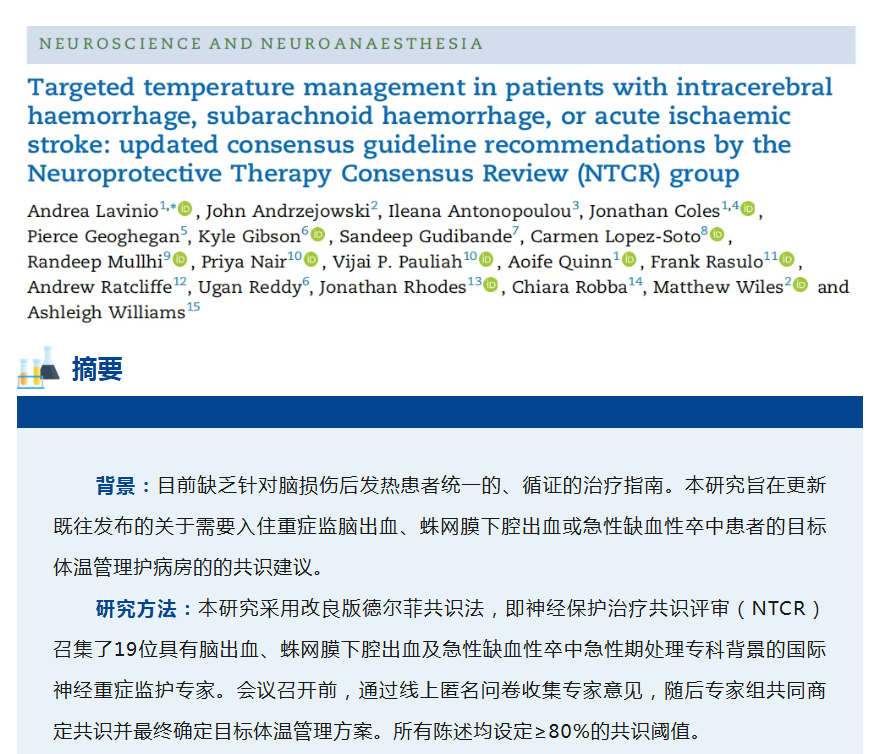 文献丨脑出血、蛛网膜下腔出血或急性缺血性卒中患者的目标体温管理:神经保护治疗共识审查(NTCR)小组更新的共识指南建议